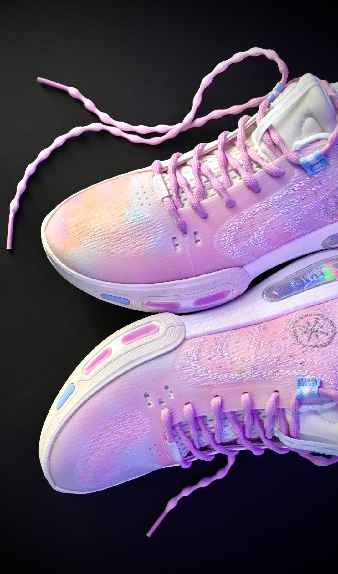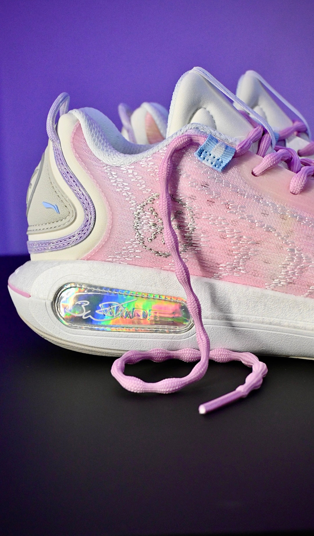 Way of Wade-Elemente befinden sich auf dem Obermaterial, der Ferse und der Sohle. Die linke Ferse ist mit „MAKE YOUR OWN WAY” und die rechte mit „CAUSE IT'S HARD” beschriftet.
